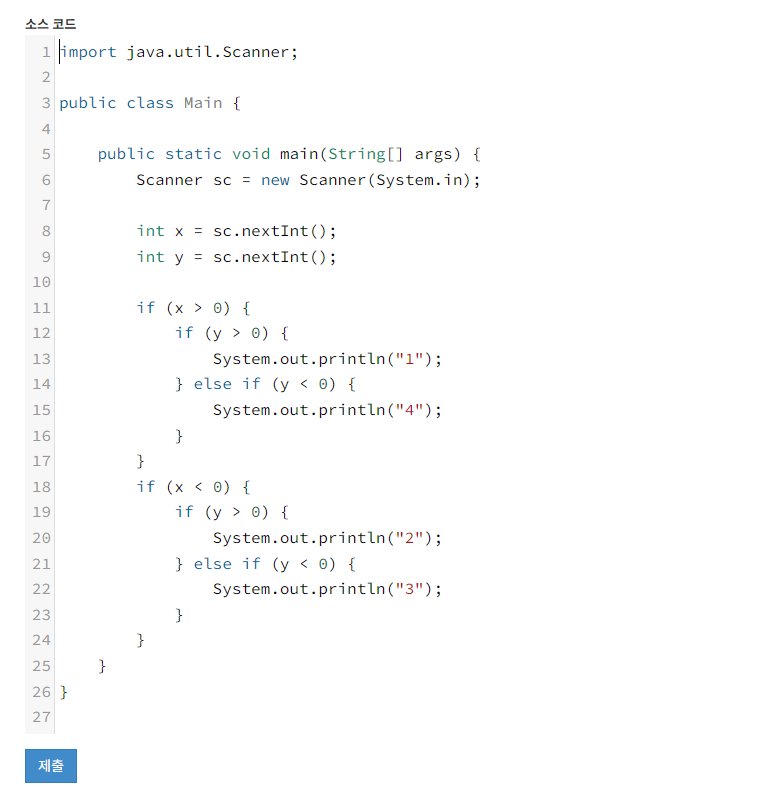 점 (x, y)의 사분면 번호(1, 2, 3, 4 중 하나)를 출력한다.
