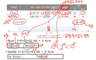 실수형은 오차라는 것이 발생할 수 있기 때문에 '정밀도'라는 것이 중요하다. 정밀도라는 것은 값을 몇자리까지 오차없이 정확하게 표현할 수 있는지를 의미하고 float의 경우 10진수로 7자리까지 오차없이 표현할 수 있다. 정밀도를 결정하는 것은 가수의 자릿수이고 float 타입의 가수는 23자리지만 정수형에서 실제로 24자리까지 저장 할 수 있다. 2의 24제곱은 10의 7제곱보다 크고 10의 8제곱보다는 작다. 그래서 float의 정밀도가 7자리인 것이다.