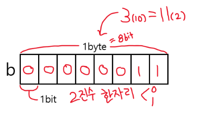b = 3; // 이처럼 변수 b에 3을 저장하면 10진수 3이 2진수로 변환되어 저장된다. 10진수 3은 2진수로 11이다. 3(10) = 11(2)