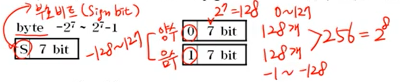 byte -2⁷~2⁷-1 // byte 타입의 변수에 값이 저장되는 형식. 즉, 저장형식은 이와 같다. 전체 8bit 중에서 왼쪽의 1bit를 값의 부호를 나타내는데 사용한다. 이 비트를 부호비트 또는 sign bit라고한다. 이 부호비트의 값이 0이면 양수이고 1이면 음수이다. 그래서 이 부호비트의 값만 보더라도 값이 양수인지 음수인지 알 수 있다. 부호비트를 제외한 나머지 7bit 로는 2의 7제곱 즉 128개의 수를 표현할 수 있으므로 양수 128개와 음수 128개 모두 256. 즉 2의 8제곱 값을 표현할 수 있다. 양수의 경우에는 0을 포함해야하기 때문에 범위가 0부터 127까지이고 음수의 경우에는 -1부터 -128까지이다. byte 타입의 전체 범위는 -128부터 127이된다.