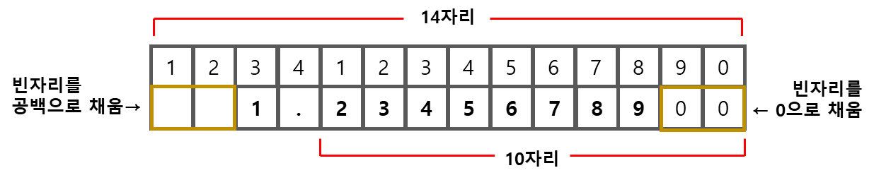 지시자 앞에 숫자를 붙히면 값이 출력되는 자리수를 조절할 수 있다.