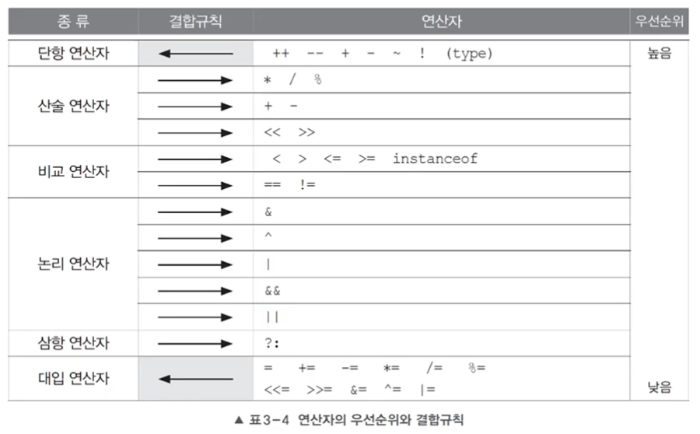 예외적으로 단항 연산자와 대입 연산자는 오른쪽에 왼쪽으로 연산이 진행된다.